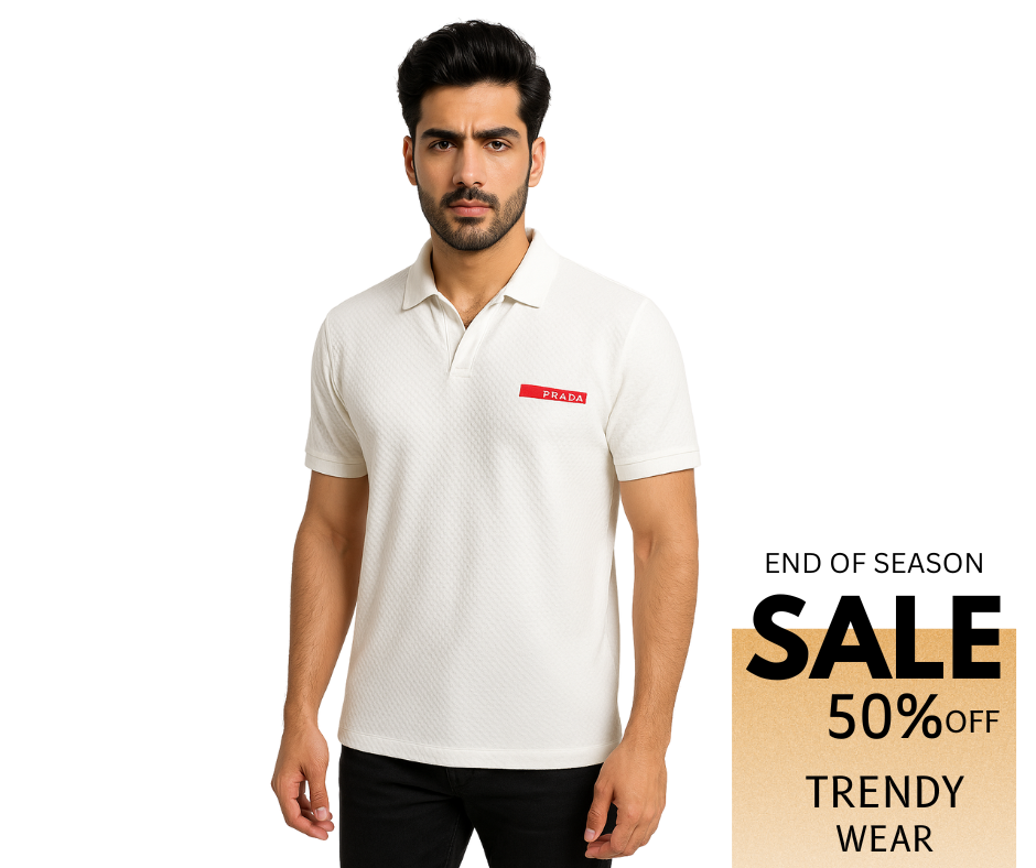 The classic polo collar and open placket provide a relaxed yet polished silhouette, while the signature red Prada tag on the chest adds a bold touch of luxury branding—discreet yet unmistakable. Its neutral beige tone makes it incredibly versatile, ideal for pairing with anything from tailored trousers to relaxed joggers.
